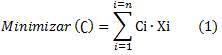 Para la situación en estudio se define como criterio de optimización minimizar los costos de producción por consumo de materias primas, la cual será la variable dependiente y se estimará mediante la ecuación 1. 1,2,3,4,5,6)