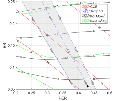 Para cada aplicación del gas producido, ER y PER deben ajustarse para lograr un rendimiento óptimo. Las zonas donde se maximizan la CGE y la electricidad neta producida no son coincidentes, esta última se encuentra desplazada hacia una menor PER y una mayor ER con respecto a la primera. Alcanzándose una electricidad neta producida en la integración a un ciclo combinado de 4 MJ/kg de bagazo con 30% de eficiencia eléctrica.