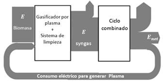 Una de las formas de gasificar la biomasa es a través del uso de plasma térmico como fuente del calor necesario para que ocurran las reacciones de gasificación esencialmente endotérmicas. Esta técnica ha sido probada fundamentalmente para el tratamiento de residuos sólidos urbanos, 3 carbón 4) y en otras biomasas. 5 A través de la gasificación por plasma es posible obtener un gas limpio adecuado para su uso en sistemas de turbinas de gas que permiten a los gasificadores integrados a un ciclo combinado (IGCC). 6 El uso de IGCC se reconoce como la forma de obtener más energía eléctrica de la gasificación, pero en el caso de la gasificación por plasma, se produce una disminución de la energía neta debido al consumo eléctrico del gasificador. 7 Es por eso que se requieren estudios termodinámicos buscando mejoras en el desempeño del proceso.
