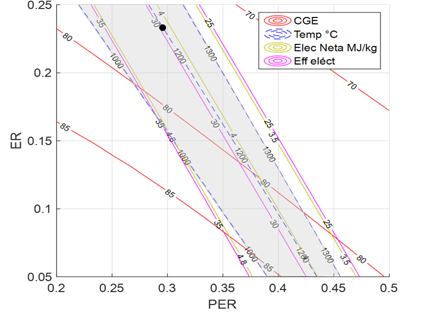 La dependencia de la electricidad neta producida de los parámetros operacionales PER y ER puede ser comprobada en la figura 3. Un incremento de PER se corresponde con un mayor consumo en la generación del plasma y por tanto menor electricidad neta producida y un incremento de ER deteriora la calidad del gas y conduce a una menor generación eléctrica. El punto negro representan un punto de operación sobre los 1200° C donde la generación eléctrica es ligeramente superior a los 4 MJ/kg, Como puede apreciarse, este punto de mayor generación no coincide con el de mayor CGE, sino que se desplaza hacia un mayor ER donde PER es menor.