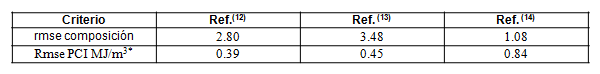 El modelo se validó con los resultados experimentales para la gasificación con aire autotérmica descrita en 12, la gasificación por plasma con aire 13 y para la gasificación por plasma con vapor 14 (Ver Tabla1). La raíz del error cuadrático de la media (rmse) en la predicción de la composición porcentual del syngas fue inferior a 3.5 y en la predicción del poder calorífico del syngas inferior a 0.85 MJ/m3.