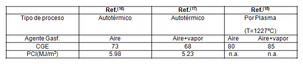 Los datos para analizar el desempeño de la gasificación de bagazo de caña fueron tomados de trabajos de otros autores (Ver Tabla 2). En ellos se pude observar valores de PCI inferiores a 6 MJ/m3 y CGE inferiores a 75 % para la gasificación autotérmica de bagazo. Mientras que en la gasificación por plasma la CGE se encuentra entre 80-85%.