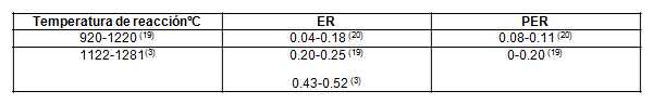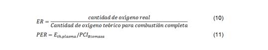 Para poder estudiar las áreas efectivas de operación de la gasificación por plasma de biomasa, se consultaron resultados experimentales presentes en la literatura, lo que permitió definir los valores aproximados de los parámetros operacionales fundamentales: relación equivalente (definida por ecuación 10) y la relación de energía del plasma (definida por la ecuación 11) así como la temperatura de reacción (Ver tabla 3).