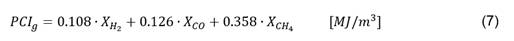 El poder calorífico del syngas da la medida de la cantidad total de calor liberado en la combustión completa de una masa o volumen unitario sin contar la parte correspondiente al calor latente del vapor de agua generado en la combustión. Para su cálculo se utiliza la expresión 7 siguiente: