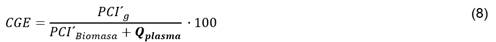 Uno de los indicadores de eficiencia más utilizados es la eficiencia del gas frío, que mide la eficiencia energética del proceso de gasificación considerando el gas producido a temperatura ambiente y su ecuación para la gasificación por plasma es tomada de 15 y expresada en términos de un mol de biomasa. Ver ecuación 8 siguiente: