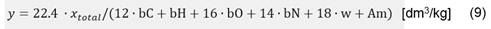 La producción específica de syngas se puede calcular aproximadamente suponiendo un valor de 22.4 como el volumen de un mol de gas ideal en dm3 a la temperatura y presión estándar (Ver ecuación 9)