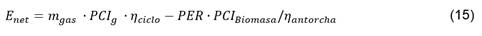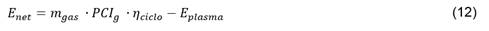 Mediante la ecuación 12 se puede calcular la energía eléctrica producida para cada kilogramo de biomasa gasificada: