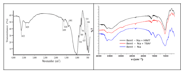 En la figura 1b se muestran los espectros correspondientes a la bentonita sódica (Bent-Na), el sistema formado por dicha bentonita sódica y TBA+ (Bent-TBA), y el formado por bentonita sódica y hexametilentetramina (Bent-HMT). En el segundo de ellos (rojo) se pueden apreciar las bandas características de vibraciones de valencia Csp3-H (cercanas a 3000 cm-1), debidas a la presencia de las cadenas alifáticas correspondientes a la oclusión del catión TBA+. En el caso del sistema con HMT el espectro es similar al de la bentonita sódica, lo que indica que no se produjo la incorporación de la molécula en las cavidades de la arcilla. La razón para dicha diferencia es la influencia de la carga positiva del TBA+, pues la presencia de la carga positiva hace más fuerte la interacción con el interior de la estructura de la bentonita cargada negativamente y de naturaleza polar.