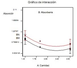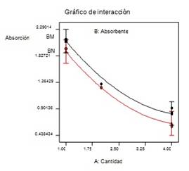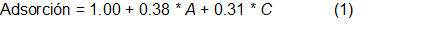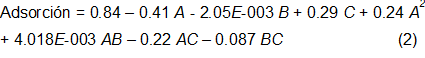 El modelo linear obtendido en términos de factores codificados (1) muestra la dependencia de la adsorcion en función de la dosis de adsorbente y del tipo de crudo. De forma similar se comporta en el modelo cuadrático, donde se reflejan además las interacciones entre ellos (2).