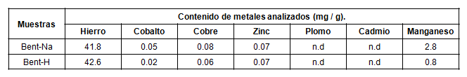 La tabla 1 muestra la composición química elemental de las arcillas de partida, expresada en mg/g. Los valores obtenidos para el metal hierro son elevados con respecto a los demás metales analizados, típicos en minerales bentoníticos. Los restantes valores no fueron significativos y en algunos casos no fueron detectados (n.d).