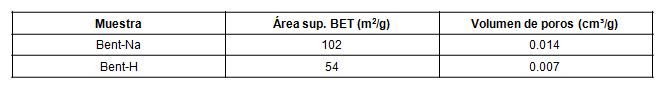Los resultados de las propiedades superficiales (tabla 2) indican diferencias en los valores obtenidos para las dos bentonitas en estudio. Para la Bent-Na se obtuvo un valor del área superficial de BET y un volumen de poros de aproximadamente el doble de lo obtenido para la Bent-H. Teniendo en cuenta los resultados obtenidos y conociendo que la capacidad de adsorción de la arcilla está directamente relacionada con sus propiedades superficiales, se seleccionó la Bent-Na para continuar con los experimentos.