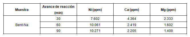 En la tabla 3 se observan los valores de concentración de los metales calcio y magnesio, cationes de cambio presentes en la Bent-Na sin ser sometida a proceso de pilarización y las concentraciones de níquel, metal incorporado por dicho tratamiento. La disminución de las concentraciones de calcio y magnesio en la muestra evidencian la incorporacion de níquel en la estructura de la bentonita, lo que se corrobora con los resultados de las concentraciones obtenidas. La bentonita sódica en su estructura base no presenta iones Ni2+ y sí otros iones de intercambio como Ca2+, Mg2+, K+, Na+; de ellos fueron analizados solamente calcio y magnesio pues no se contaba en el Laboratorio de Análisis con lámparas de los demás metales.