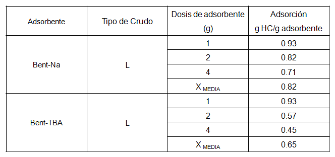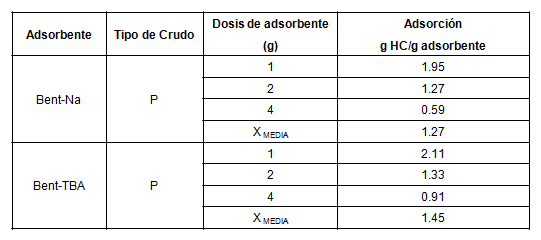 Las pruebas de adsorción para los materiales Bent-Na y Bent-TBA se realizaron con los crudos L y P. Los resultados se muestran en las tablas 4 y 5 respectivamente.