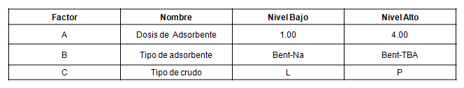 Para los ensayos de adsorción se elaboró un diseño de experimentos D óptimo con 3 factores, uno numérico (dosis de adsorbente) y dos categóricos (tipo de adsorbente y tipo de crudo), utilizando el programa Design Expert versión 6.0.1 de Stat - Ease Corporation (2000).