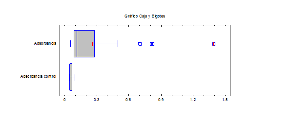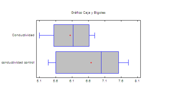 Para obtener las relaciones existentes entre los grupos tratados y control así como en las combinaciones de tratamiento magnético empleadas, se aplicó primeramente un Anova simple en el cual se realizó la comparación de muestras independientes para cada variable respuesta donde se evaluaron 27 muestras de yogur fortificado tratado con sus respectivos controles durante 3 días de experimentación. Las variables respuesta analizadas fueron: conductividad eléctrica, pH y absorbancia a 280 nm. En la figura 4 se puede observar que existe una diferencia significativa entre los grupos de muestras elaboradas con el tratamiento magnético y las muestras controles, para un 95 % de confianza. Esto indica que la conducción eléctrica de los iones en la solución de yogur fortificado puede estar siendo influenciado por el tratamiento magnético recibido ya que no solo se trata a los microorganismos; sino el medio de cultivo del yogur, con presencia de gluconatos férricos disminuyendo el tiempo de fermentación y aumentando la viabilidad del ácido láctico y por ende las concentración celular. 8,11