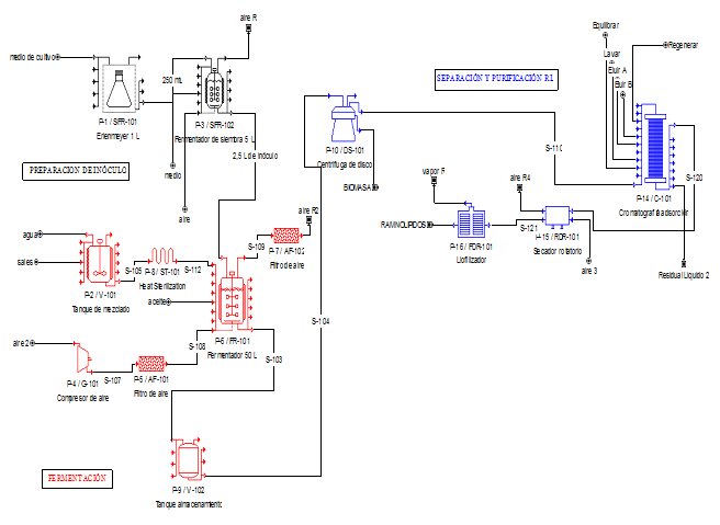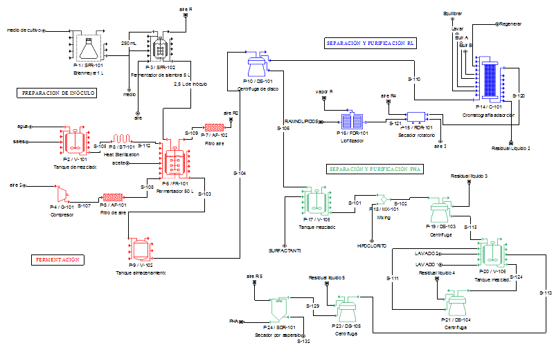 El proceso de producción consta de tres etapas: preparación del inóculo, fermentación y separación y purificación del producto. El inóculo se prepara inicialmente en un matraz Erlenmeyer(SFR-101) de 1L de capacidad con 250 mL de medio de cultivo inoculado con una colonia bacteriana crecida en Placa de Petri por 24 horas. Este medio se utiliza para inocular (10 % v/v) un fermentador (SFR-102) de 5L con 2,25 L de medio de cultivo, siendo éste el inóculo a utilizar para la obtención del ramnolipido. Para la fermentación se utiliza un fermentador de tanque agitado (FR-101) de 50 L de capacidad donde se transfieren 22,5 L de medio de cultivo estéril, 2,5 L de inóculo y 1% v/v de aceite residual para un total de 25 L de volumen de trabajo. Al finalizar la fermentación en 50 horas, el medio de cultivo que contiene el biosurfactante es separado de la biomasa mediante centrifugación (DS-101) y para su purificación se utilizó el método de adsorción/desorción según la metodología descrita por Tiso y col. 16) La biomasa que contiene el PHA es tratada con una mezcla de surfactante-hipoclorito para la recuperación del polímero según la metodología descrita por Choi y Lee. 17 Finalmente ambos productos son secados por liofilización.