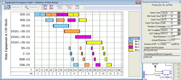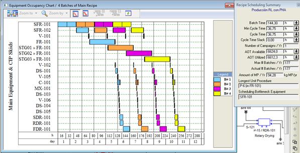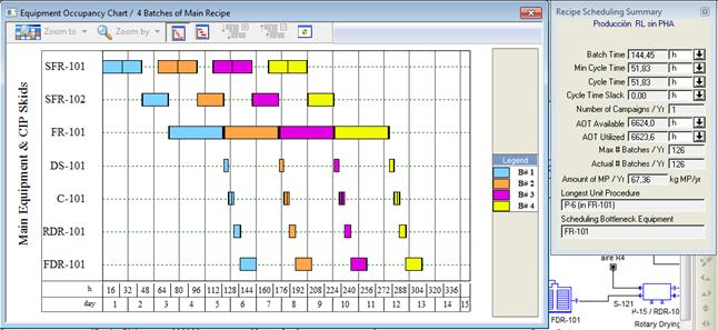 Como se observa en la figura, no hubo cambios en la duración del ciclo productivo para producir un lote del producto (144 horas), ni en el número de ciclos de producción que se realizan al año (126), produciéndose 67 kg de ramnolípidos y 11 kg de PHA. Las operaciones que se ejecutan para la separación y purificación de ambos productos (ramnolipidos y PHA) se realizan de forma paralela no afectando la duración del ciclo de producción.
