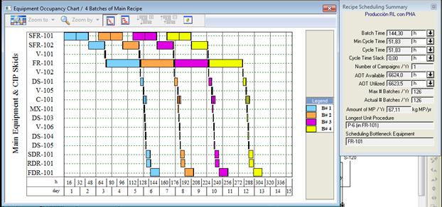 Una de las ventajas que tiene el empleo de un simulador es su capacidad de modelar los aspectos que son dependientes del tiempo en un proceso discontinuo, lo cual permite la generación automática de la planificación de todo el proceso13. En la figura 2 se observa la planificación de cuatro ciclos de producción consecutivos de la propuesta tecnológica 1, con un resumen de la planificación delamisma (esquina superior derecha). Cada ciclo se representa con un color diferente.