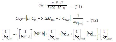 El consumo específico de energía eléctrica (See, kW·h/g de metal) se calcula por (11) y el costo de operación por (12).