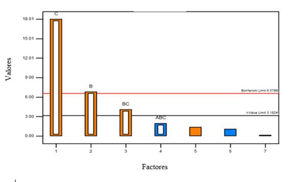 En el Diseño Factorial 23 los resultados del ANOVA mostraron significación (p<0,05) de las variables tiempo y temperatura, y de su interacción (tabla 1). Esto implica que la influencia de índice de degradación varía en función de los factores operantes en el sistema biodegradativo, sin embargo el comportamiento de la variable concentración de cultivo no es descrito con suficiencia por el modelo. En el gráfico de Pareto se observa la contribución de las variables al modelo, la mayor contribución fue para el tiempo de biodegradación (82%) seguido de la temperatura (11%) e interacción de ambos factores (4%).