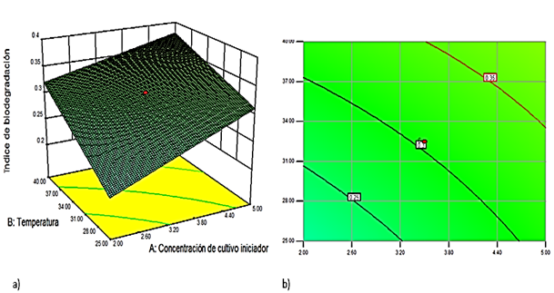 En el gráfico de superficie respuesta, las líneas de contorno indican claramente el efecto de la temperatura y la concentración de cultivo sobre el índice de biodegradación (figura 2). Al incrementarse la temperatura y la concentración del cultivo se incrementa la biodegradación. Sin embargo, el efecto de la concentración de cultivo no fue significativa (p>0,05). Según varios autores la temperatura es un factor crucial en los sistemas biodegradativos ya que seleccionan los microorganismos y los complejos enzimáticos que actúan sobre el sustrato permitiendo un mayor deterioro (con su incremento), hasta valores límites. Aunque en el modelo no se encontró un punto de inflexión de la temperatura, en muchos sistemas es un factor limitante capaza de detener el proceso biológico ya que la mayoría de los microorganismos y sistemas enzimáticos se inactivan a temperaturas superiores a los 55°C.