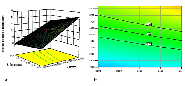 El análisis de superficie de respuesta del modelo obtenido indica que el comportamiento de las variables en el proceso en el tratamiento de los residuos sólidos posee un efecto positivo (figura 1 y figura 2). En las condiciones de estudio se encontraron valores de biodegradabilidad entre moderadas y altas. Se obtuvo un punto máximo extremo (A: 96 días; B: 32ºC y C: 2.5%) donde teóricamente se tiene la mejor condición de operación del proceso de de biodegradación, en el cual se obtienen valores óptimos de la variable respuesta (IB=0,4525) para las condiciones experimentales evaluadas. En este punto, las líneas de contorno de la superficie en la relación de concentración-densidad (figura 1 y figura 2), permite inferir que se está cerca de la región del óptimo, pues es apreciable la tendencia creciente. Por tal motivo, podrían realizarse otros procesos de optimización colocando puntos hacia el exterior del diseño hasta localizar el óptimo local.
