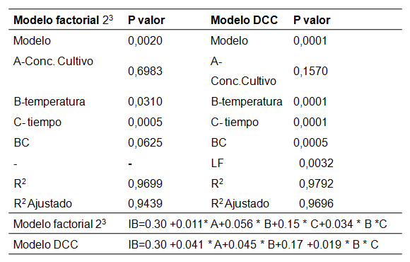 Cuando se incluyeron puntos centrales y se evaluaron nuevamente los datos en un diseño central compuesto DCC (manteniendo el principio de ortogonalidad) excluyéndose los términos que no fuesen significativos (p < 0.05) hasta obtener los resultados más ajustables. Se pudo observar en el análisis estadístico de varianza un mejor ajuste de los datos al modelo (tabla 1). (R2= 0.9239) con una función de tipo lineal (tabla 1). Donde se verifica que las variables tiempo, temperatura fueron significativas al igual que la interacción tiempo/temperatura. La significancia del Lack of Fit (LF) indica que el buen ajuste de los datos observados y los estimados.