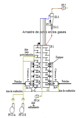 La sustitución, a pesar de garantizar que se mantuvieran los índices de eficiencia metalúrgica y de ser factible preliminarmente desde el punto de vista económico, presentaba la dificultad de no modelar el efecto provocado por la postcombustión10 y los arrastres de polvo que existen habitualmente en estos equipos, ver figura 1.