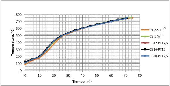 Se puede apreciar, figura 2, que cada uno de los experimentos realizados mantuvo un aumento gradual de la temperatura con un tiempo de residencia que osciló entre los 71 y 74 minutos, corroborando de esta manera las investigaciones realizadas sobre esta temática.2,7,9 Al comparar el perfil térmico mostrado en cada una de las mezclas se puede llegar a la conclusión de que todos los experimentos fueron sometidos a un régimen de calentamiento similar, sin presentar desviaciones significativas entre cada uno de ellos.