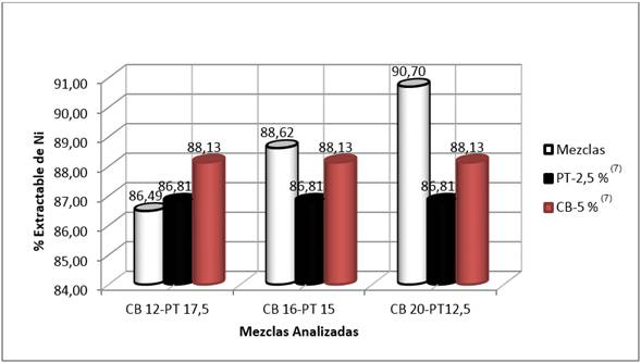 En el caso de utilizar la mezcla CB20-PT12,50 se puede observar que el extractable de Ni se incrementó en más de un 2,57 %, en comparación con los resultados obtenidos con los aditivos utilizados como patrón.