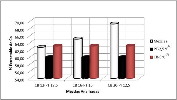 El porcentaje de las extracciones de Co para las mezclas investigadas se muestra en la figura 4. Se puede apreciar que la tendencia que presentó fue similar al obtenido para las extracciones de Ni, logrando los mejores resultados al utilizar como aditivo la mezcla CB20-PT12,50 ya que permite incrementar las extracciones de Co en un porcentaje superior a 9,40.