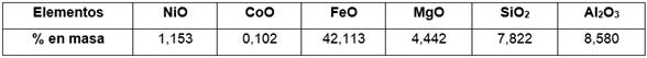 Las lateritas utilizadas corresponden a las menas que existen en los yacimientos Camarioca Este, Yagrumaje Norte y Yagrumaje Sur en la zona norte de la provincia de Holguín en una proporción de 47,53; 36,72 y 15,74 % másico respectivamente. Formaba parte de una muestra tecnológica previamente homogenizada, secada y triturada con el objetivo de lograr un grado de homogenización mayor del 80 %, una humedad menor o igual que el 5,0 % y un tamaño de partícula inferior a los 50 mm. En la tabla 1 se muestra la composición química promedio de los elementos fundamentales presentes en la misma.