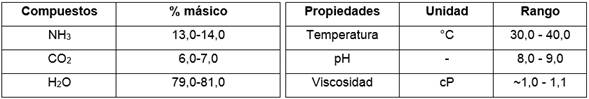 El licor carbonato amoniacal fuerte tiene una densidad que oscila entre 1,02 y 1,03 t/m3. En la tabla 2 se presentan sus características más importantes.