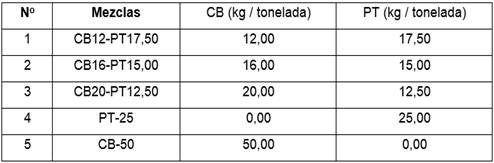 CB16-PT15,00: Mezcla de aditivo formada por 16,00 kg de CB y 15,00 kg de PT, por tonelada de mineral laterítico en base seca.