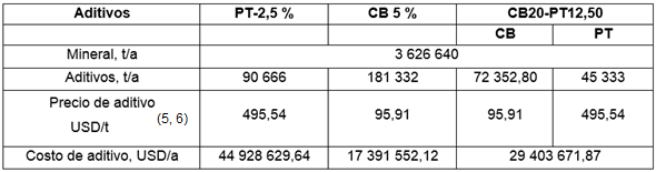 CB20-PT12,50: Mezcla de aditivo formada por 20,00 kg de CB y 12,50 kg de PT, por tonelada de mineral laterítico en base seca.