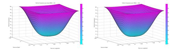 La sustitución de la composición del producto (proteínas: 13,83%; grasas: 16,36%; carbohidratos: 1,69%, agua: 63,39%; cenizas: 3,47%; fibra: 1,82%) en las ecuaciones de Choi y Okos reportó expresiones en función de la temperatura, mientras que en los modelos obtenidos se obtuvieronvalores de las propiedades correspondientes a la composición de agua en el producto (tabla 7). La solución de la ecuación (2) mediante el empleo de las ecuaciones de Choi y Okos (tabla 7), considerando una temperatura de 71ºC en el centro térmico de la pieza, alcanzada a las 2,5 h, reportó un coeficiente pelicular de transferencia de calor de 497 W/m2.ºC. En la tabla 8 se presentan los perfiles de temperatura obtenidos mediante las ecuaciones de Choi y Okos y los modelos obtenidos, destacándose la similitud de los resultados alcanzados por ambas vías. La diferencia entre los perfiles resultó de manera general inferior a 1%, lo que evidencia la validez de los modelos propuestos. La diferencia de los perfiles calculados con relación a las temperaturas medidas experimentalmente fue de hasta 5,5% para las ecuaciones de Choi y Okos, y de hasta 7,7% para los modelos propuestos a las 0,5 h de cocción. Estas diferencias resultaron inferiores a 1% a las 1,5 y 2,5 h de tratamiento térmico. Para la estimación del coeficiente pelicular de transferencia se partió de las ecuaciones de Choi y Okos considerando la temperatura promedio del producto entre su valor inicial (10ºC) y la temperatura del agua de cocción (80ºC), sin embargo, durante la primera media hora de proceso la temperatura dista más de este valor promedio, pudiendo ser esta la causa de la diferencia antes señalada. Esta situación cambia en los tiempos posteriores en que se realizaron las mediciones. En las figuras 1a y b se muestran los perfiles 3D, obtenidos a las 2,5 h de cocción a partir de las ecuaciones propuestas.