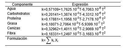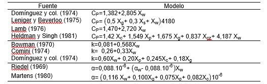 A partir de modelos reportados en la literatura, dependientes del contenido de agua y otros componentes, se generaron valores de la capacidad térmica específica (CP) y la conductividad térmica (k), los que constituyeron la fuente a partir de la cual se ajustaron modelos en función del contenido de humedad (ecuación 1):