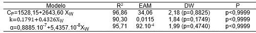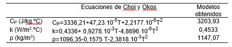 El ajuste de los datos de las propiedades termofísicas generados a partir de los modelos de la literatura (tabla 1) reportó los modelos de predicción que aparecen en la tabla 6 y sus estadígrafos correspondientes.
