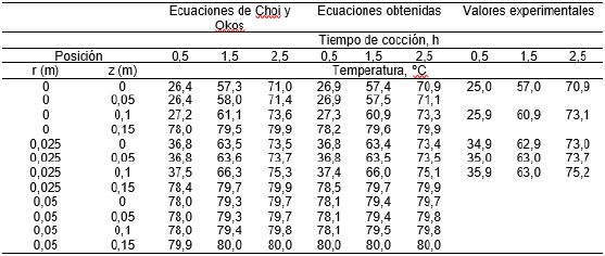 Los modelos propuestos resultan válidos para la estimación de la capacidad térmica específica, la conductividad térmica y la difusividad térmica. La estimación de estas propiedades resultó independiente de la temperatura en el intervalo decocción (10 - 80ºC), siendo solo dependientes del contenido de humedad del producto. Esto queda validado por la similitud entre los perfiles de temperatura obtenidos mediante las ecuaciones de Choi y Okos y los modelos propuestos. La diferencia entre ambos es menor de 1% a las 1,5 y 2,5 h de cocción. Esta diferencia es igual a la obtenida entre los perfiles calculados por ambas vías con el obtenido por medición de la temperatura en el producto. El coeficiente pelicular de transferencia de calor para las condiciones de operación fue de 497 W/m2.K.