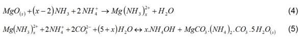 La carbonatación del licor amoniacal disminuyó la concentración de sobresaturación (ver figura 1 b). Cuando la relación NH3/CO2 disminuye desde 2,0 a 1,5, la resultante de velocidad de lixiviación (k0) aumenta, se favorece la nucleación y disminuye la sobresaturación, también incrementa la velocidad de precipitación (k1) con relación inversamente proporcional a Cssat. En ausencia de dióxido de carbono el magnesio no se lixivia (ver tabla 4).