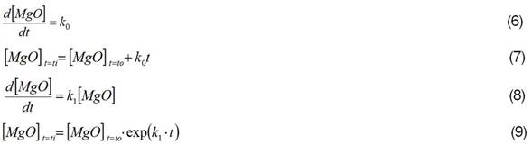 Por su parte, al aumentar la temperatura de lixiviación de 42 a 54 ºC, incrementó la resultante de velocidad de lixiviación del magnesio k0 de 8,77 a 13,56 g/L·min-1 y disminuyó k1 de precipitación de 0,087 a 0,044 min-1, aumentando la concentración de sobresaturación de 409 a 600 g/L. Luego, al elevar la temperatura la solubilidad aumenta y el fenómeno de disolución a temperatura constante es endotérmico (Ver figura 2 a y tabla 5).