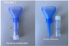 Las muestras de HNF y saliva fueron recolectadas por el mismo personal técnico del laboratorio de la institución, siguiendo procedimientos operativos estandarizados. La toma de muestra de saliva se obtuvo con dispositivos de recolección pasivo de saliva (Figura 1). Estos dispositivos fueron amablemente proporcionados por el Dr. Cyril Gueydan de la Universidad Libre de Bruselas (ULB). La recolección de saliva se realizó en pacientes que no se cepillaron los dientes, comieron o bebieron momentos antes del muestreo. Después de una explicación sobre los objetivos del proyecto y sobre el uso del dispositivo recolector de saliva, se solicitó a cada participante de auto-recolectar pasivamente su muestra de saliva, depositando aproximadamente 1 ml directamente en el dispositivo de recolección que contenía 1 ml de medio de transporte e inactivación del virus (VTM Life Science Park, ShenZhen, China). Paralelamente se tomó una muestra nasofaríngea utilizando hisopos de dacrón provistos con el mismo kit de VTM, que posteriormente fué depositado en el mismo medio de transporte de inactivación. Las muestras fueron identificadas y almacenadas a -20 °C hasta la extracción de ARN y su procesamiento por RT-PCR.