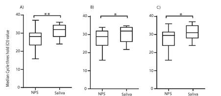 Los valores de Ct de los tres genes diana (ORF, N y S) del SARS CoV-2, que fueron positivos para ambas muestras (HNF y saliva), se compararon por separado mediante la prueba t pareada. Los CTs de las muestras de HNF fueron significativamente más bajos que los CTs de las muestras de saliva para los genes ORF (p = 0,007), N (p = 0,0325) y S (p = 0,0323). Estos datos muestran que las muestras de HNF presentaban una carga viral más alta que la muestra de saliva (Figura 1).