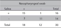Methods: Thirty saliva and nasopharyngeal swab samples from patients with COVID-19 symptoms who were admitted to the emergency department of the Viedma Clinical Hospital were taken in parallel. Both samples were analyzed by RT-PCR for the detection of SARS-CoV-2. The concordance of results was calculated using the Cohen's Kappa coefficient.