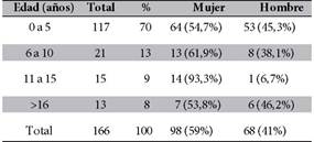 De las 166 personas estudiadas, 98 (59%) fueron Mujeres y 68 (41%) fueron varones. Las edades oscilaron entre recién nacidos y adultos, con una distribución etaria mostrada en la Tabla 1.