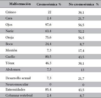 El análisis de las dismorfias fue hecho en base a una comparación entre los niños con alteración cromosómica y los que tienen cromosomas normales, y nos muestra que las malformaciones congénitas más frecuentes en pacientes con alteración cromosómica fueron: epicanto en ojos en un 97,6%, seguida de cuello corto y dismorfias en extremidades, con 80,5% y 85,4% respectivamente. Las malformaciones en orejas, como implantación baja y microtia entre otras, representan el 75,6%. Las de nariz un 63,4%; las de tórax, 46,3%, dentro de este grupo (Tabla 3).