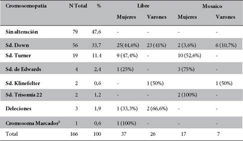Conclusions: The most frequent chromosomal disorders were Down syndrome, Turner syndrome, and Edwards syndrome. Most chromosomal results were complete or free of alteration in the different syndromes. The mother's and father's age and the number of abortions appear to be risk factors for Down syndrome, and for Turner syndrome.