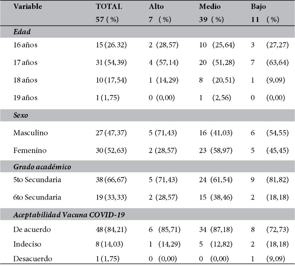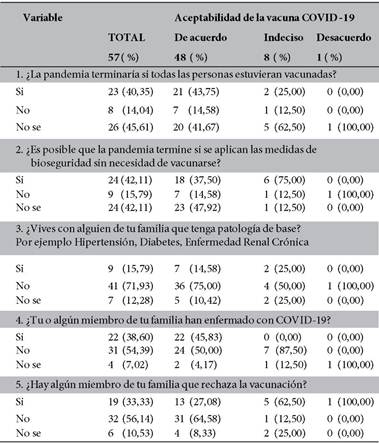 Para la aceptabilidad, se tomó en cuenta si había recibido o quería recibir las dosis de la vacuna contra el SARS- CoV-2. Con respuestas posibles “de acuerdo”, “desacuerdo” o “indeciso”. Se incluyeron preguntas adicionales acerca del impacto de la vacunación (terminación de pandemia, dejar de lado otras medidas de bioseguridad), así como la experiencia frente al Covid-19 en el entorno familiar (comorbilidades en la familia, si alguien padeció de Covid-19 y si aceptaban o rechazaban la vacuna) para complementar dicha parte, con las mismas opciones de respuesta.