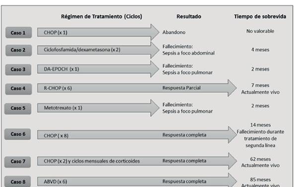 Los tres pacientes restantes, fueron tratados de la siguiente manera: régimen DA-EPOCH (dosis ajustada de etopósido, prednisona, vincristina, ciclofosfamida, doxorrubicina) (caso 3); altas dosis de metotrextato (caso 5) y combinación de ciclofosfamida y corticoides (caso 2), sin embargo, en ninguno de estos pacientes se pudo completar los ciclos programados debido a complicaciones infecciosas y toxicidad hematológica (Figura 1).