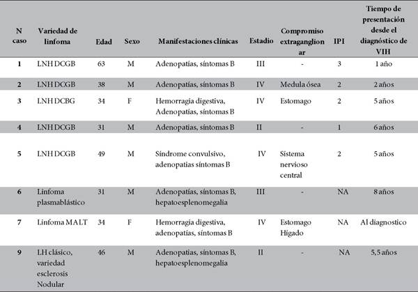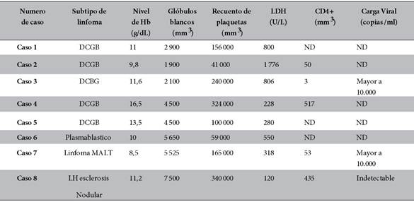 De los siete casos de LNH, cinco (71,4%) eran del subtipo DCGB y los restantes correspondían al linfoma plasmablástico y al linfoma de tejido linfoide asociado a mucosas (MALT) respectivamente. El caso de LH correspondía a la variedad esclerosis nodular (Tabla 1).